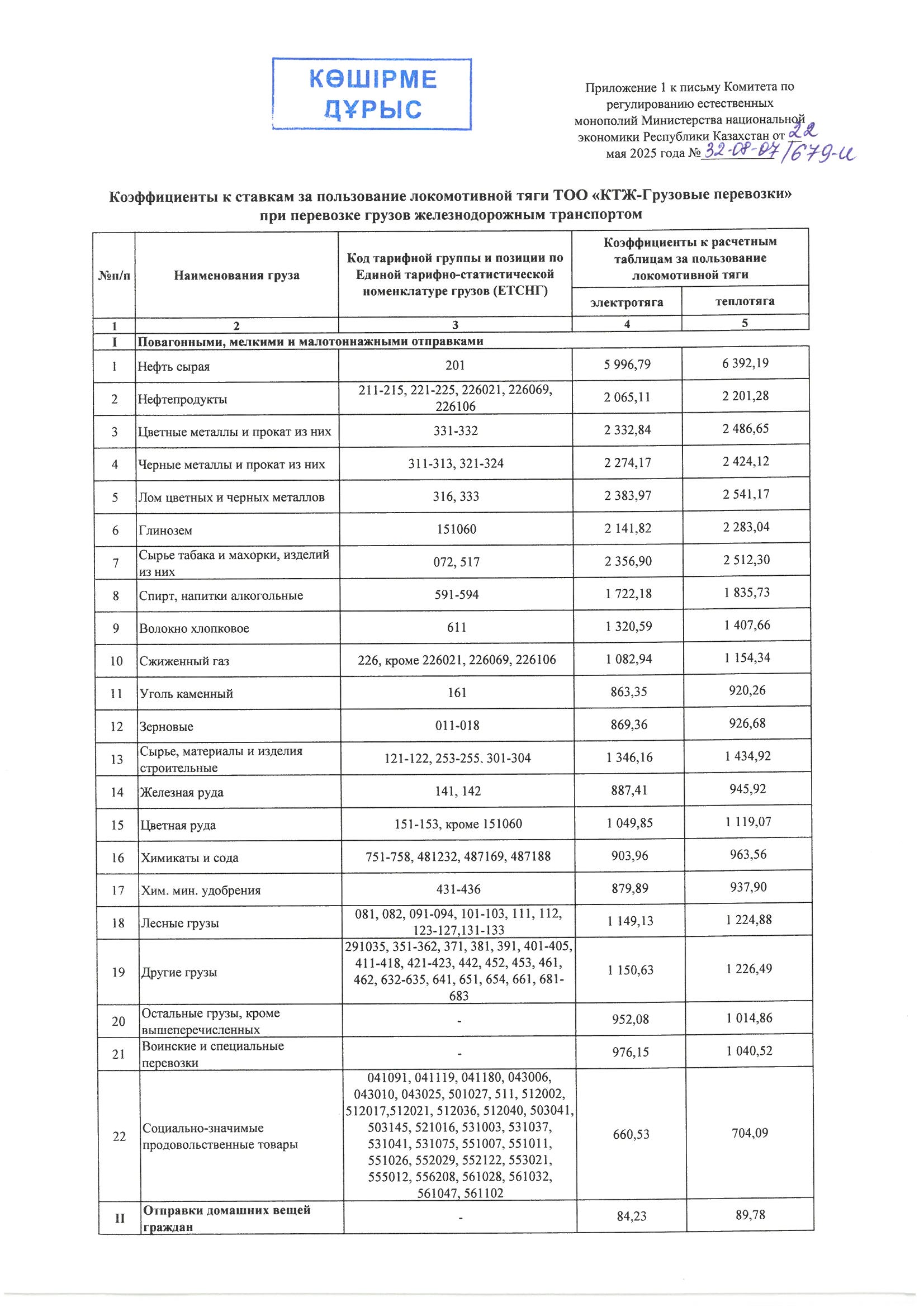 С коэффициентами к ставкам за пользование локомотивной тягой КТЖ-ГП при перевозке грузов железнодорожным транспортом можно ознакомиться в приложении.